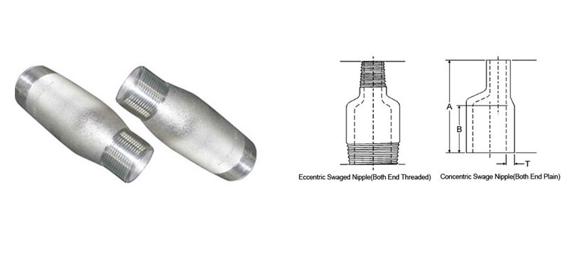 n ISO 9001:2008 Certified Company,Technico Stainless specialises in Manufacturing swage nipples in India. Swage Nipples are manufactured accordance with MSS-SP-95 (Design Specification), ASME BS 3799, ASTM A105, A350-LF2, A106, A312, A234, A403, ASTM A182 (F304, F304L, F316, F316L). Swages or Swage Nipples are a type of pipe connection fitting used to go from one size tubing or casing to another. Some of the common grade swage nipples we manufacture include A234-WPB, A403-WP316, A403-WP304, and A420-WPL6 in size range of 1/4″ through to 8″ forconcentric swage nipplesand 1/4″ to 4” for eccentric swage nipples. We can offer Swage Nipples with plain, beveled or threaded ends. Thickness and outside diameters of swage nipples shall correspond to those of the appropriate nominal pipe size. Swage nipples are offered in threaded ends per ASME B1.20.1 and beveled ends per ASME B16.25.All swage nipples manufactured by Technico Stainless are either manufactured from seamless pipe or bar material and have suitable working pressure equivalent to straight seamless pipes. We use high quality raw materials (steel pipes, bar stock) for Manufacturing stainless steel swage nipples and carbon steel swage nipples. The raw materials we use are fully traceable to the mill source through our MTR reports. Our products are manufactured as per customer specifications and in accordance with international standards including American Standard (ASTM/ANSI), the British Standard (BS), and the DIN/European standard. NPT threads on Swage Nipples conform to ANSI/ASME B1.20.1.